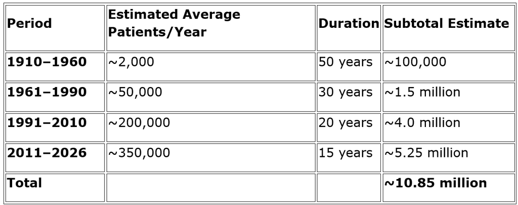 No one can provide an exact, named‑patient count from 1910 to 2026.
